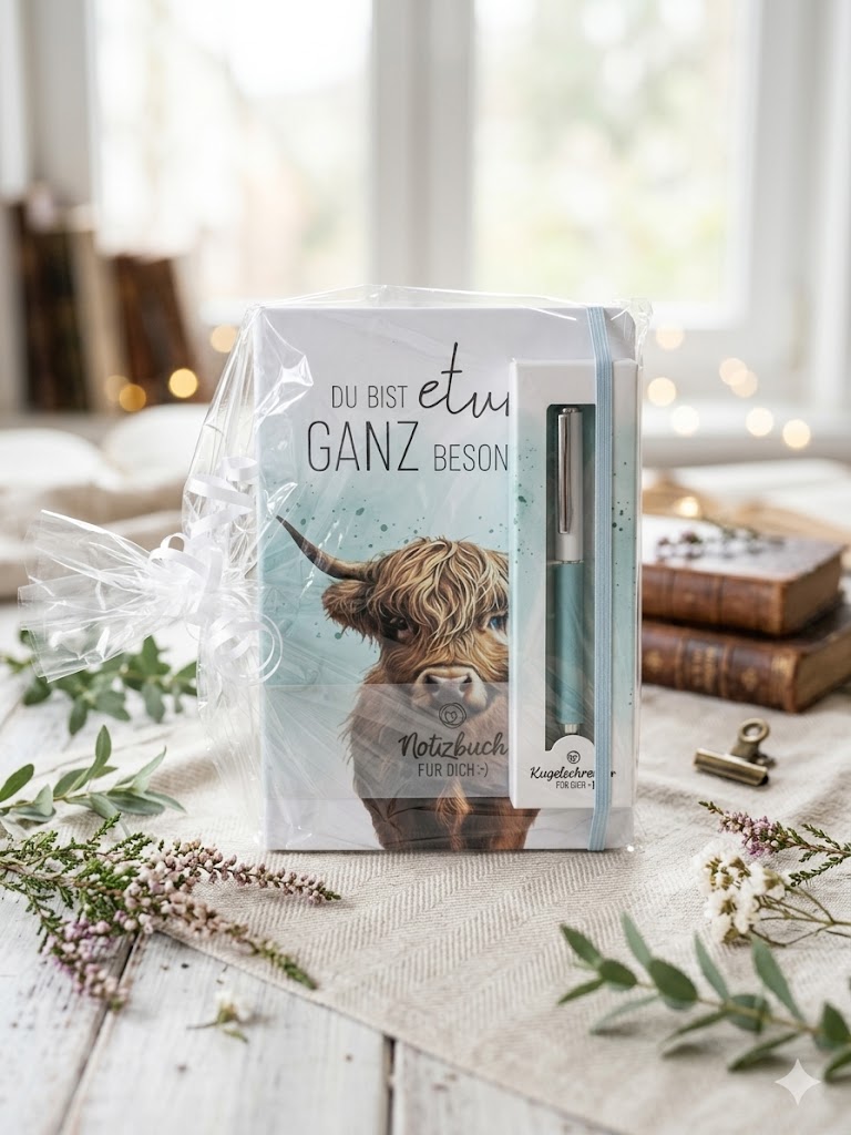 Geschenkset „Du bist etwas GANZ Besonderes“: Hochwertiges Notizbuch mit Hochlandrind-Motiv & passendem Kugelschreiber. Fertig verpackt – ideal zum Verschenken!