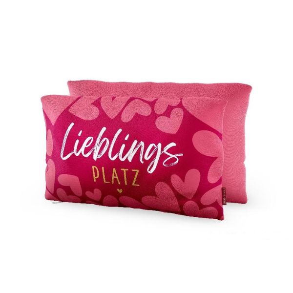 - Design und Optik: Das Kissen ist in verschiedenen Rosatönen gehalten und mit zahlreichen Herzen in unterschiedlichen Größen gemustert.