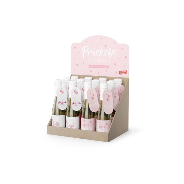 Das charmante Display mit Sektflaschen im Mini-Format bietet eine spritzige Möglichkeit, „Danke“ zu sagen oder einen besonderen Moment zu feiern.