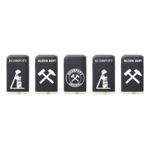 • Ruhrpott-Edition: Die Feuerzeuge sind in einem matten Schwarz gehalten und mit typischen Motiven der Bergbau-Region verziert, wie dem Förderturm, gekreuzten Hämmern (Schlägel und Eisen) sowie den Schriftzügen „RUHRPOTT“ und „GLÜCK AUF!“.